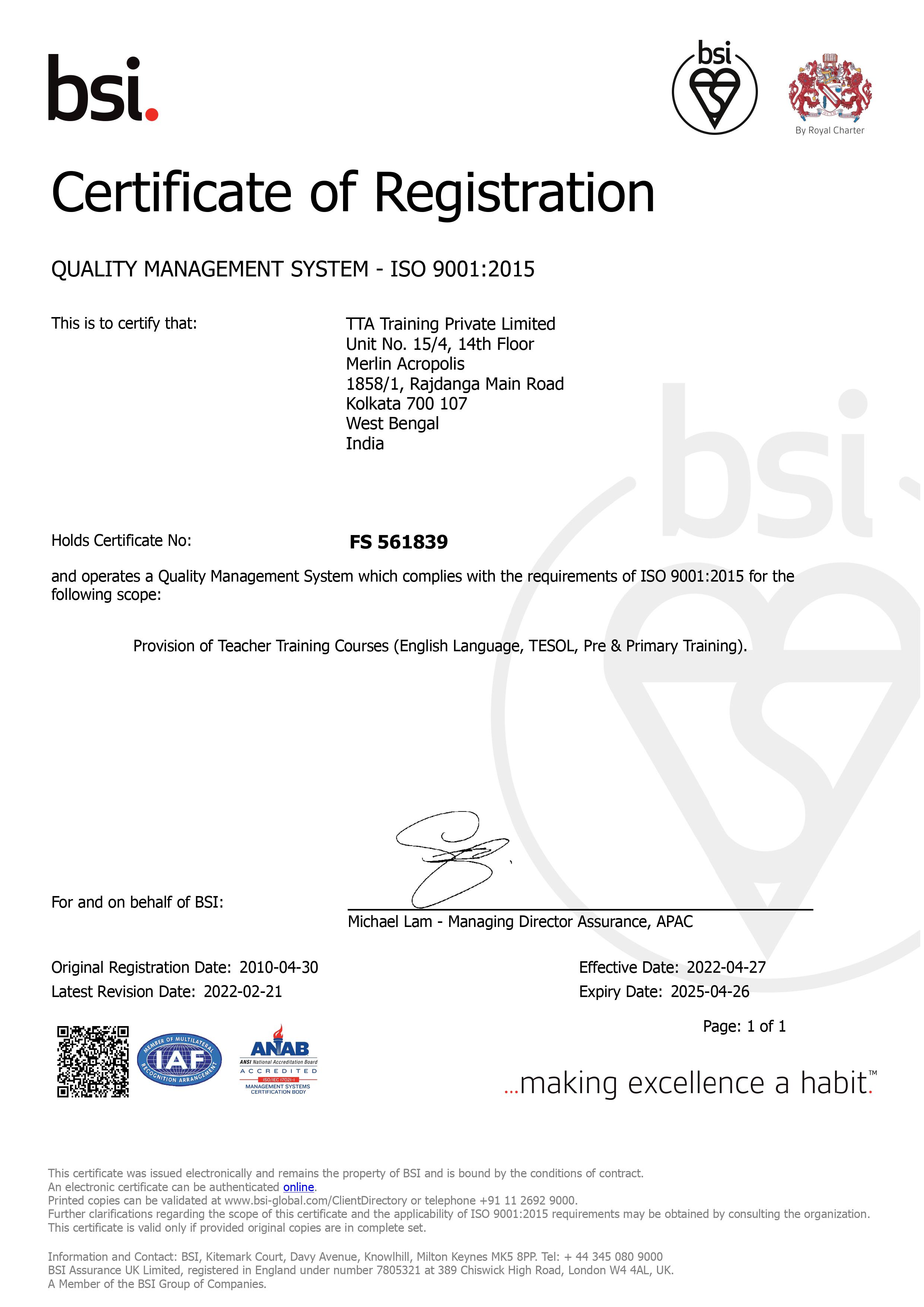 TTA Training Pvt. Ltd. that trades as Asian College of Teachers is registered under the Ministry of Corporate Affairs, Government of India.
